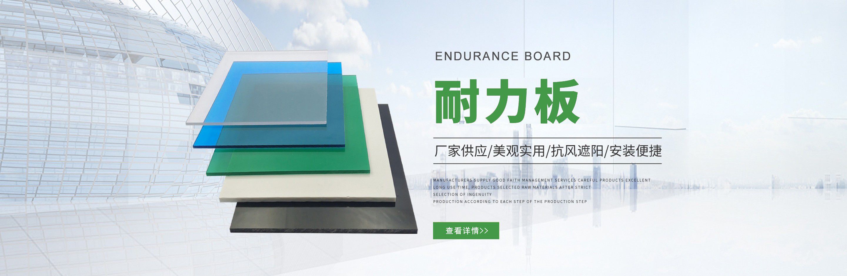 聊城市沐金塑膠有限公司注冊資金2180萬元,占地20000余平方,擁有自建廠房15000平方,員工100余名。10余年來,公司主營耐力板,鎖扣耐力板,耐力板深加工,無動力通風器,組合雨搭,PVC硬脂板,耐力板廠家等板材的發(fā)展戰(zhàn)略,逐漸成長為綜合性企業。  公司擁有多條板材共擠生產線,采用世界知名品牌進口原材料和先進工藝,依據完善的ISO9001質量管理體系和ISO14001環(huán)境管理體系,為產品的卓越品質提供了強有力的保證。憑借過硬的創新能力和堅實的硬件基礎,贏創已成為國內領先的熱塑性板材生產商,產品被廣泛應用于建筑業、農業、工業、廣告業、安防行業及DIY領域。  公司始終致力于通過提供最優(yōu)的板材應用解決方案,為客戶創造最高的價值;堅守創新、質量、靈活、服務和速度的核心價值觀;堅持“完美的產品需要完美服務的支持”的經營理念,努力實現成為世界領先的板材與解決方案供應商的夢想。  在未來,公司將立足客戶需求,不斷改變和完善現有產品,拓展產品線和充分開發(fā)板材的應用領域,為客戶創造全方位的價值。同時更好地實現員工的價值,實現公司團隊的價值。我們將與您一起創贏未來!  企業使命:成為世界領先的板材與解決方案供應商。  公司愿景:通過提供最優(yōu)的板材應用解決方案,為客戶創造最高的價值。  核心價值觀:質量...